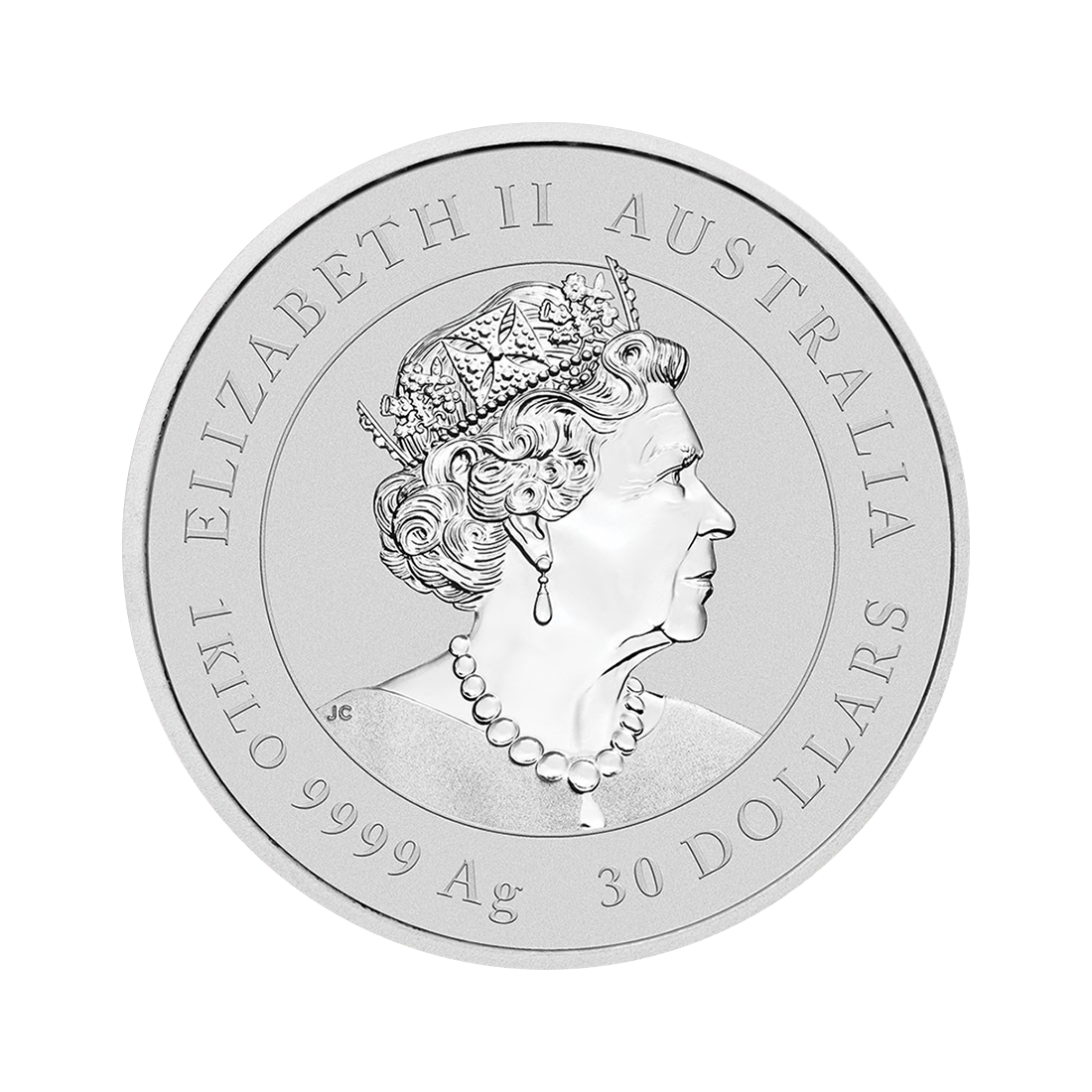 The obverse features an image of Her Majesty Queen Elizabeth II by Jody Clark, surrounded by the dates of her reign, as well as the face value, silver weight, and purity of the coin.
