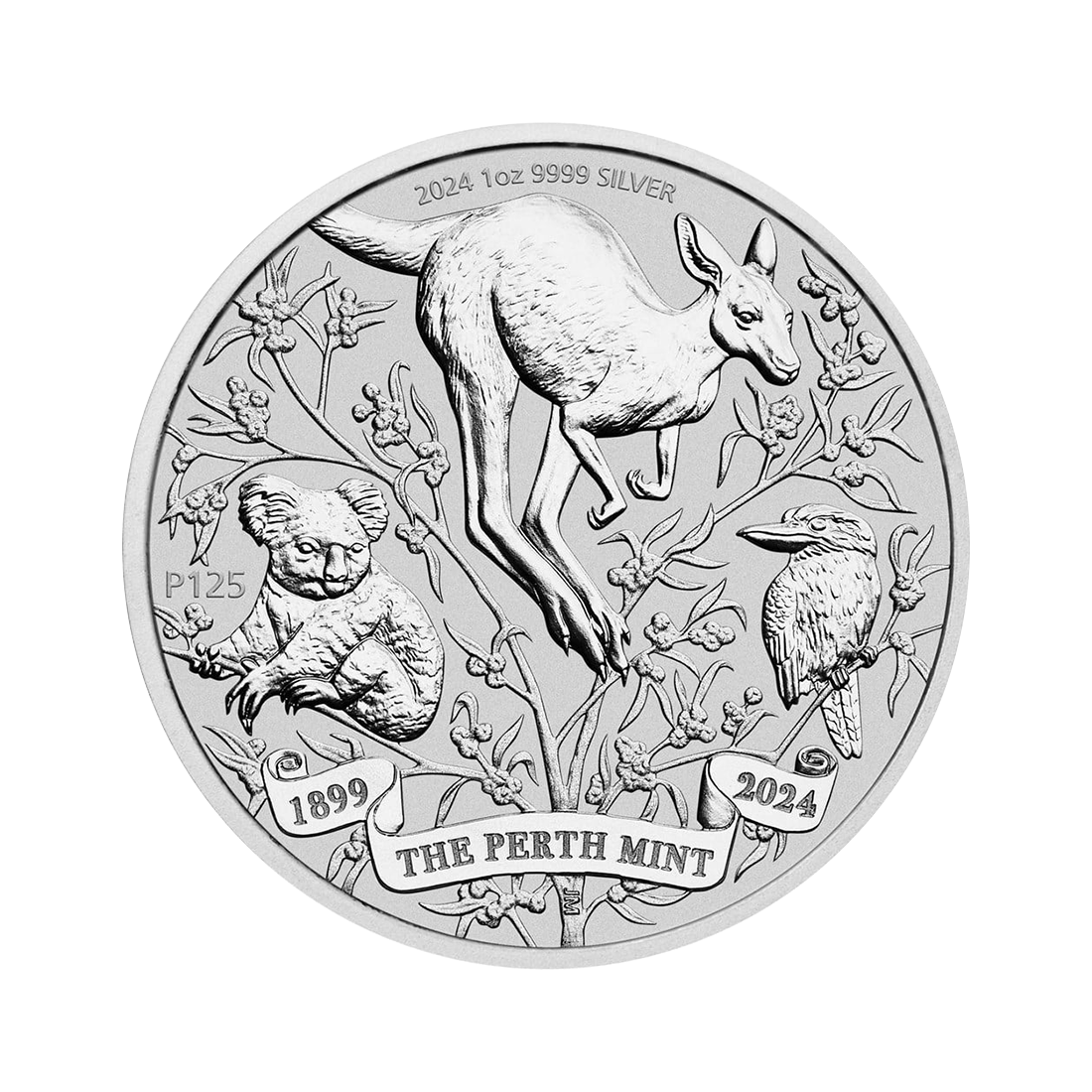 On this coin, which references the manufacturer's well-known series of coins, a kangaroo, kookaburra, and koala have been artistically placed among golden acacia trees, symbolizing Australia's national flower. At the bottom of the coin is the inscription: 1899 THE PERTH MINT 2024. Additionally, the mint mark P125 and information about the weight, purity, and year of minting are visible.