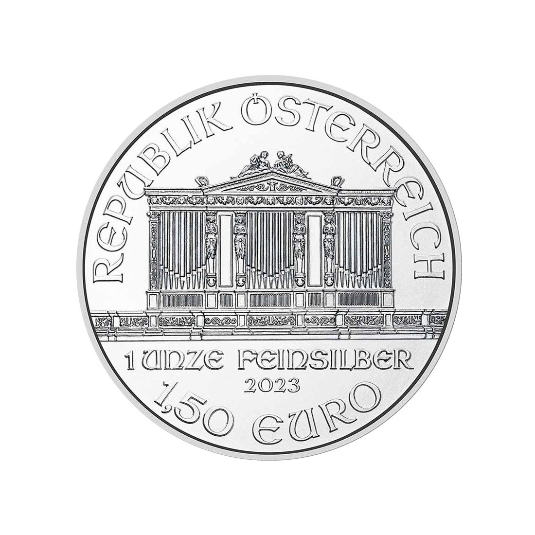 The silver version of the coin has been issued since 2008. The obverse depicts the huge organ of the Golden Concert Hall in Vienna. Below, the weight of the coin, its fineness, year of issue, and denomination—1.5 euros—are indicated. The official name of the country, "Republik Österreich," also appears.