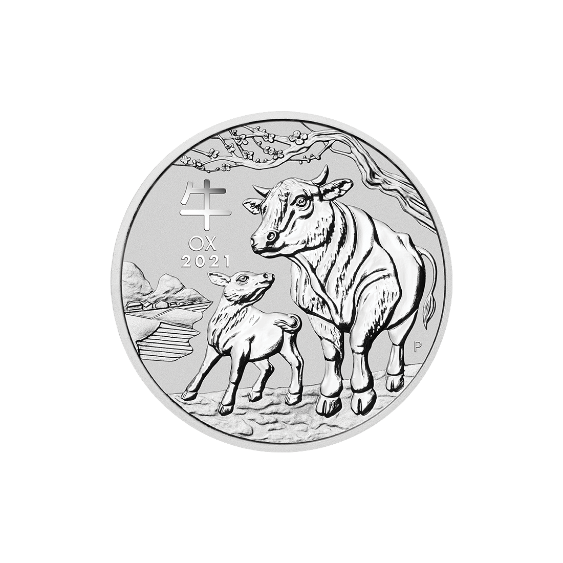 The reverse of the coin depicts an ox with a young calf facing an older representative of the species. The animals are shown in their natural habitat – in the bosom of nature. Next to the oxen are the mint mark of the manufacturer (P), the year of minting (2021), and the name of the animals in two languages (Chinese and English).