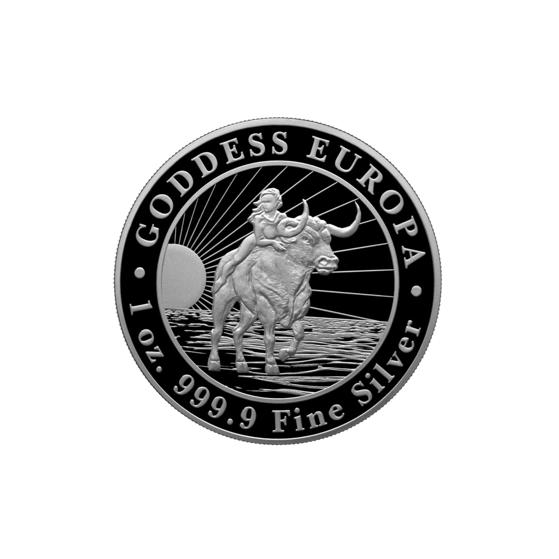 The reverse depicts a scene from Greek mythology: the goddess Europa riding a bull, which is Zeus in disguise. In the background, the sun is rising above the horizon, adding dynamism and depth to the composition. The reverse also features the inscription "GODDESS EUROPA" and information about the weight and purity of the metal.