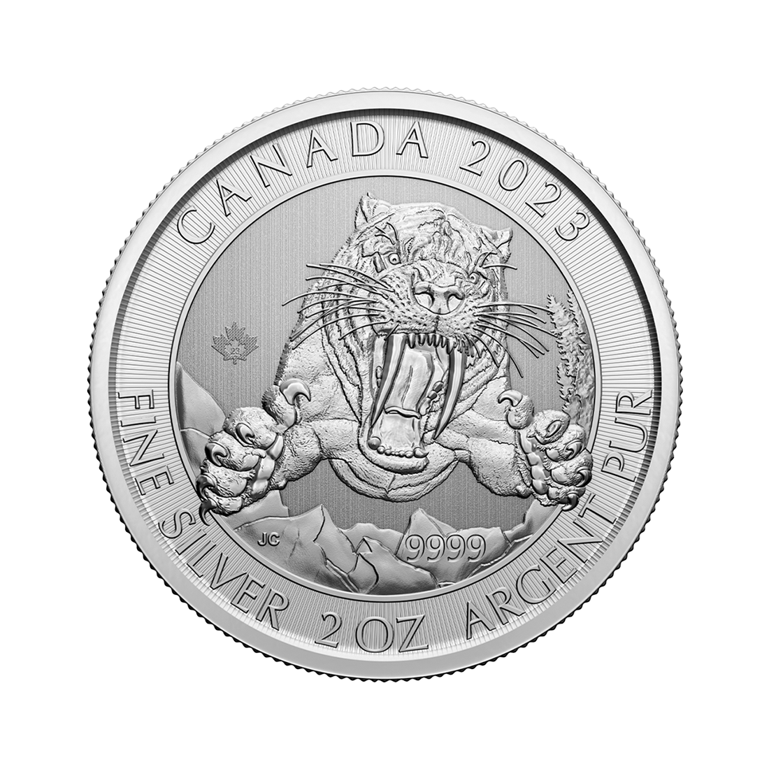 The expressive composition captures the power and predatory nature of the prehistoric saber-toothed tiger. The reverse depicts the majestic animal in a dramatic scene of attack – with its mouth open, revealing its impressive, elongated fangs. The image of the animal in motion gives the whole design a sense of energy and realism, making the motif almost "come alive" on the surface of the metal. The background is formed by mountain landscapes, which not only create the atmosphere of the predator's natural environment, but also reinforce the symbolism of the power and severity of nature. The obverse features a classic portrait of Queen Elizabeth II, in accordance with the official Canadian design. There are also inscriptions around the edge indicating the denomination and country of issue, which gives the coin a formal, prestigious character and confirms its status as legal tender.
