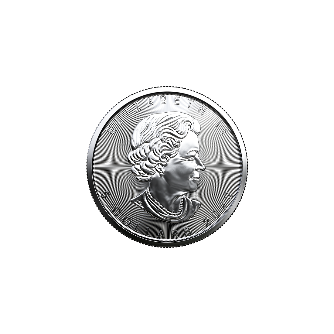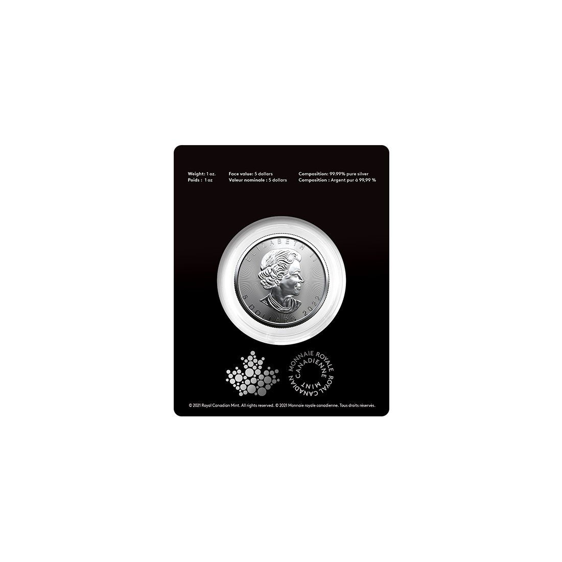 The reverse features a maple leaf and information about the weight and fineness of the silver – in English and French. The obverse depicts the image of the ruler with the coin's face value and date of issue.