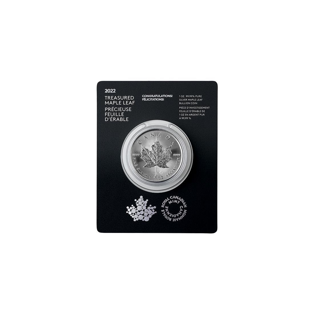 This time, the Canadian Maple Leaf silver coin comes with elegant packaging. The commemorative blister pack features the inscription "Congratulations," and you can add a few words inside, so the coin can be given as a gift right away.
