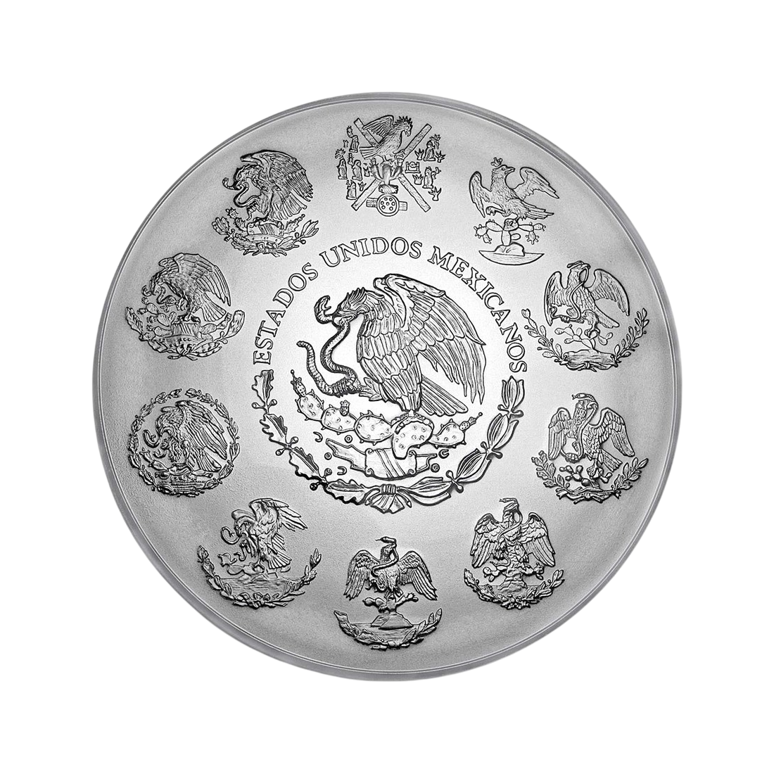 The design of the Libertad silver coin is considered one of the most beautiful in the world of numismatics. The reverse features a majestic statue of Victoria, symbolizing the triumph of Mexican independence, which serves as a backdrop for two iconic volcanoes: Popocatépetl and Iztaccíhuatl. These mountains tell a romantic and tragic love story similar to "Romeo and Juliet," which gives the coin cultural and historical depth. The reverse also contains key investment information: weight (1 kg), fineness (999), and date of minting. The obverse is adorned with the current emblem of Mexico – an eagle sitting on a cactus, surrounded by symbols representing the ten Mexican provinces, emphasizing the national character of the coin. This combination of historical symbolism, artistic craftsmanship, and impressive weight makes the Libertad not only a high-potential investment product, but also a work of art that gains in appeal over the years. Choosing this coin is choosing heritage and craftsmanship.