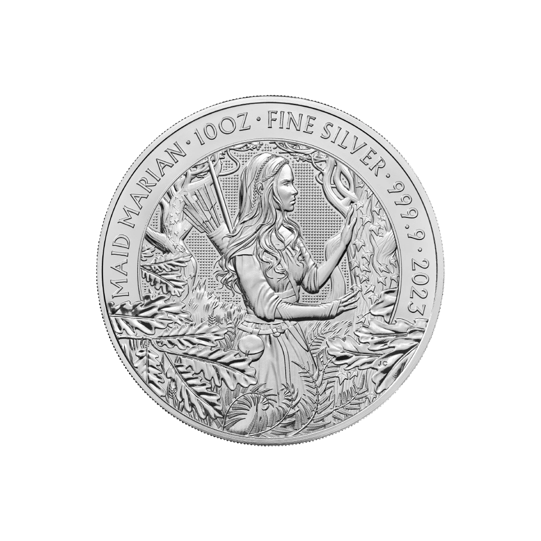 The 10-troy-ounce Lady Marian silver coin is the latest addition to the hugely popular Myths and Legends series issued by the prestigious British mint, The Royal Mint. This impressive coin is a perfect combination of artistic craftsmanship and the real value of precious metal, making it an attractive choice for those looking for solid assets for their investment portfolio. Lady Marian, a character inextricably linked to the legend of Robin Hood, is depicted in a modern and dynamic way, giving the coin a unique collectible character without detracting from its investment value.