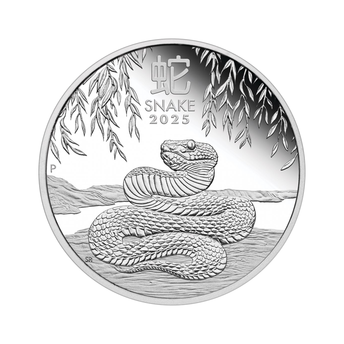 The 2025 Year of the Snake silver coin is part of the highly regarded Lunar III series issued by the renowned Perth Mint in Australia. It is made of pure silver and features a detailed image of a snake on the reverse. This is the symbol of the Chinese lunar year 2025, associated with wisdom and intuition. The obverse of the coin features an image of King Charles III. The coin is distinguished by its high quality, unique design, and collectible value, making it an excellent choice for both investors and numismatics enthusiasts.