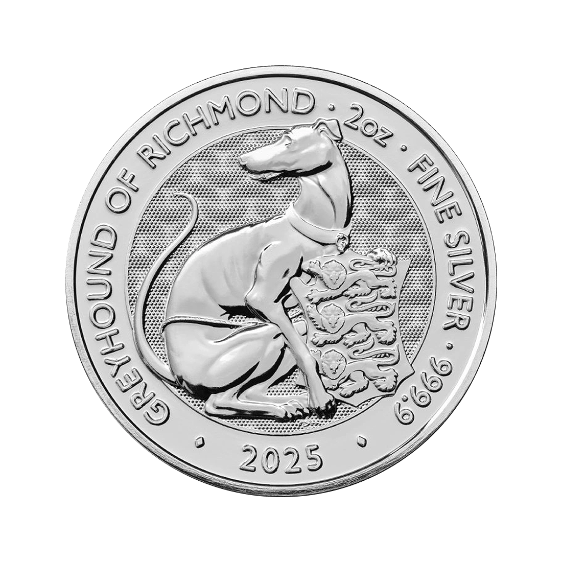The coin was created as part of a series dedicated to the heraldic beasts of the Tudor dynasty, which since the 16th century have served as symbols in the architecture, art, and heraldry of the English monarchy. The Richmond Greyhound, depicted on this coin, was historically associated with the royal family and its court symbolism, serving as a sign of fidelity, speed, and loyalty, and appearing in palace decorations and heraldic sculptures in Tudor residences, including Hampton Court Palace.