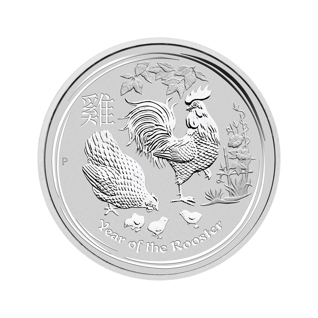 The reverse of the coin features an artistic scene depicting a rooster, a hen, and three chicks amidst bamboo leaves and flowers. This design symbolizes family, self-confidence, and diligence—traits attributed to those born in the Year of the Rooster. This side also features the Chinese character for rooster, the inscription “Year of the Rooster,” and the traditional mint mark “P.” The obverse features an image of Queen Elizabeth II by Ian Rank-Broadley, along with information on the denomination, year of issue, and metal fineness.