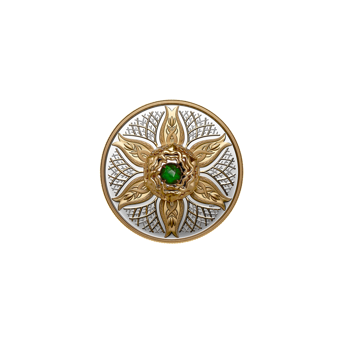 The reverse of the coin depicts a flower blooming against a backdrop of earthy root and branch patterns. The composition has been created with attention to every detail, reflecting the beauty and stability of the element. In the center is a natural ammolite set in an elegant frame – a stone that moves with the slightest movement of the coin, creating a mesmerizing effect of dancing light. This dynamic phenomenon makes each coin attract attention not only as a collector's item, but also as an aesthetic investment object.