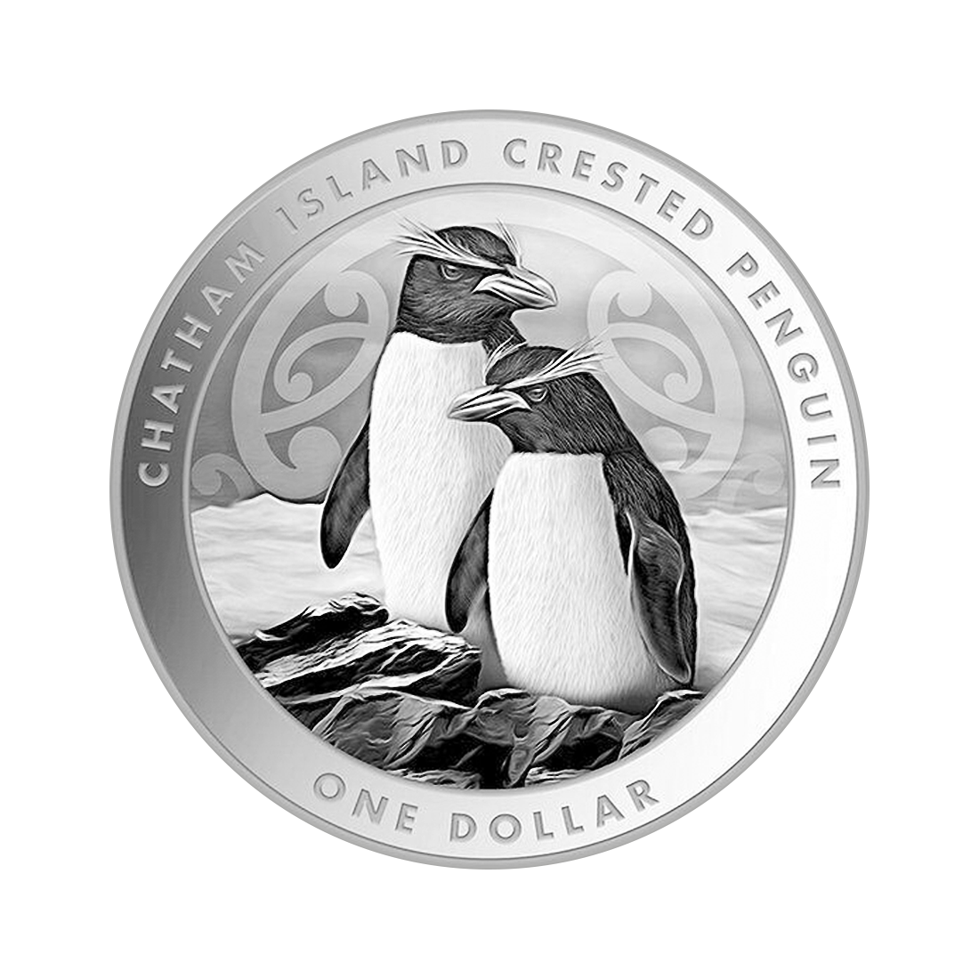 The reverse of the silver coin features an image of a pair of crested penguins standing on a rock surrounded by the ocean. In the background of the main image, you can also see the New Zealand koru pattern, symbolizing the shape of a curled fern leaf. The whole image is surrounded by the inscription "Chatman Island Crested Penguin." The reverse design was created by Dave Burkle.