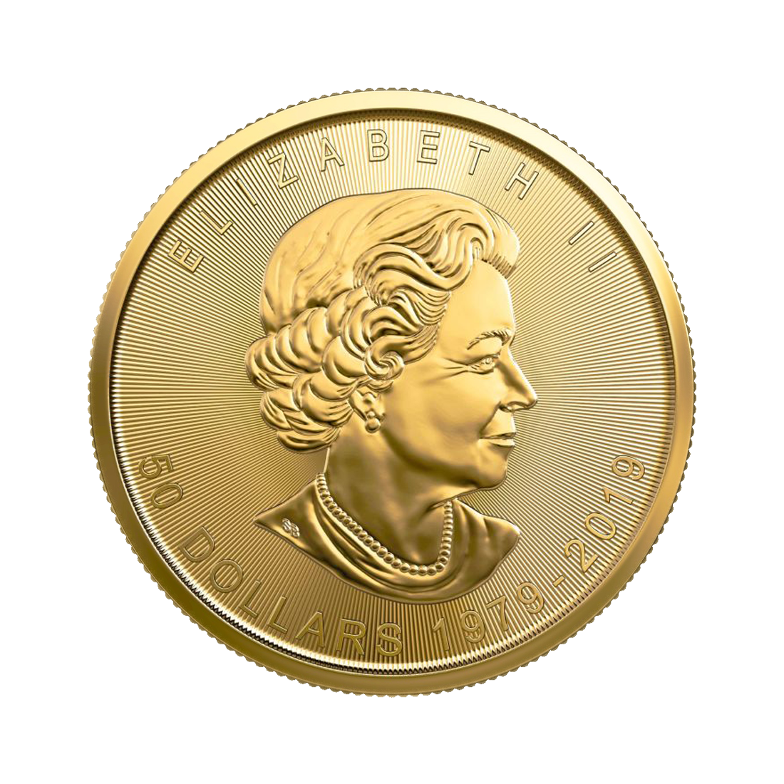 The obverse features an image of Queen Elizabeth II. As a member of the Commonwealth, Canada had Queen Elizabeth II as its reigning constitutional monarch. Above the image of the Queen is her name, ELIZABETH II, and at the bottom of the coin is the face value of $50 and the years 1979-2019, marking the 40th anniversary of the coin's issue.