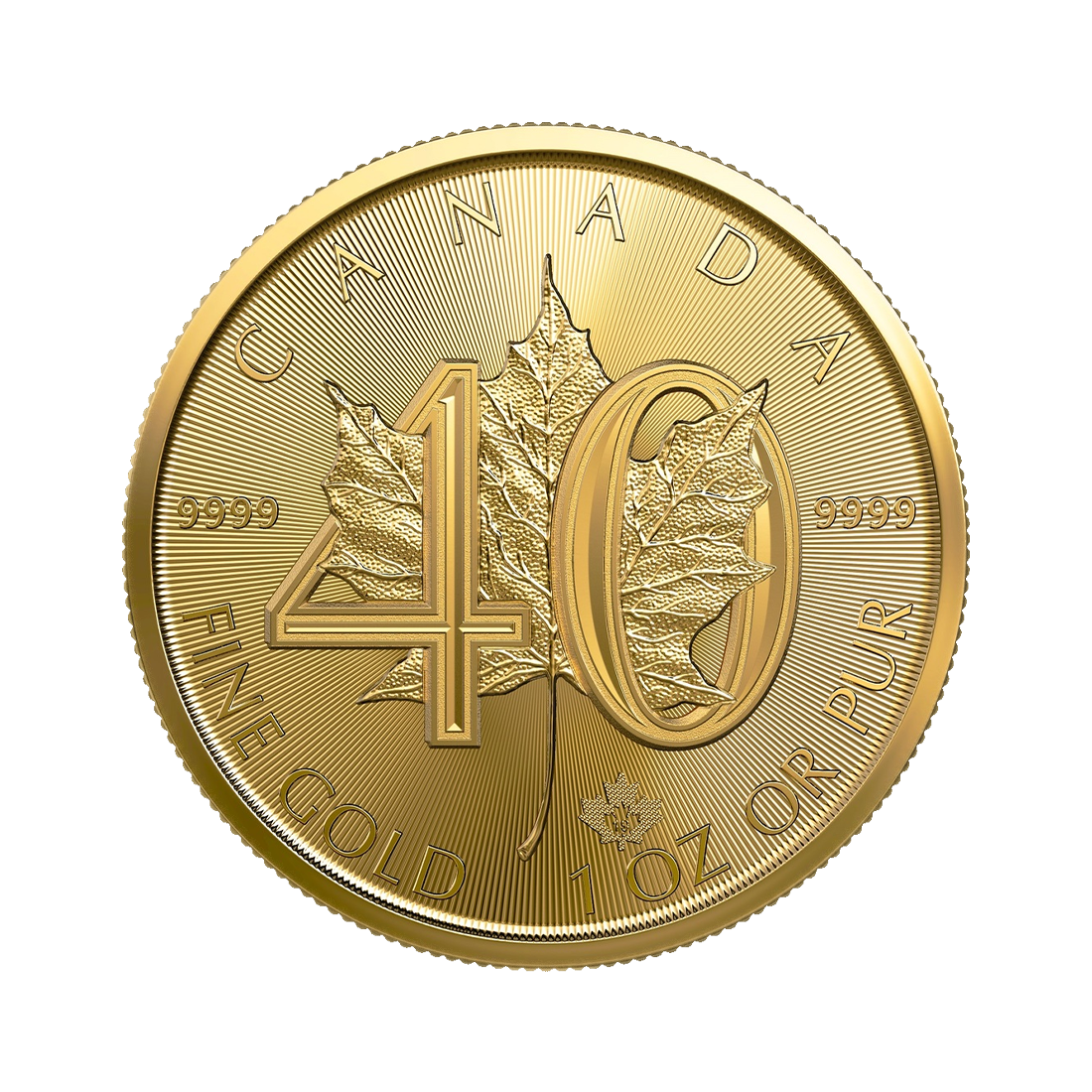 The reverse features Canada's national symbol, the Maple Leaf, entwined with the large number 40 and the inscription CANADA above it. To the left and right of the maple leaf are four nines side by side (referring to the purity of the coin's metal), beneath which is engraved a tiny security mark and the text FINE GOLD 1 OZ OR PUR (1 ounce of pure gold).
