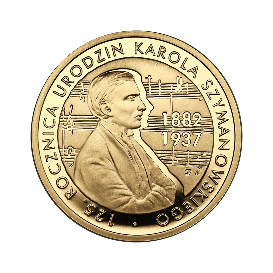 The reverse depicts a half-length portrait of Karol Szymanowski in profile. In the background, there is a continuation of the composer's score and the dates of his birth and death. Parallel to the edge, there is an inscription reading "125th anniversary of Karol Szymanowski's birth."