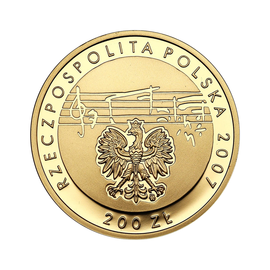 The obverse of the coin features the national emblem in the background, against which we can see a reproduction of a fragment of the original score written by Karol Szymanowski. All of its elements are presented using concave relief. The inscription "Rzeczpospolita Polska 2007" (Republic of Poland 2007) runs around the images, and the denomination "200 zł" (200 zlotys) is placed below.