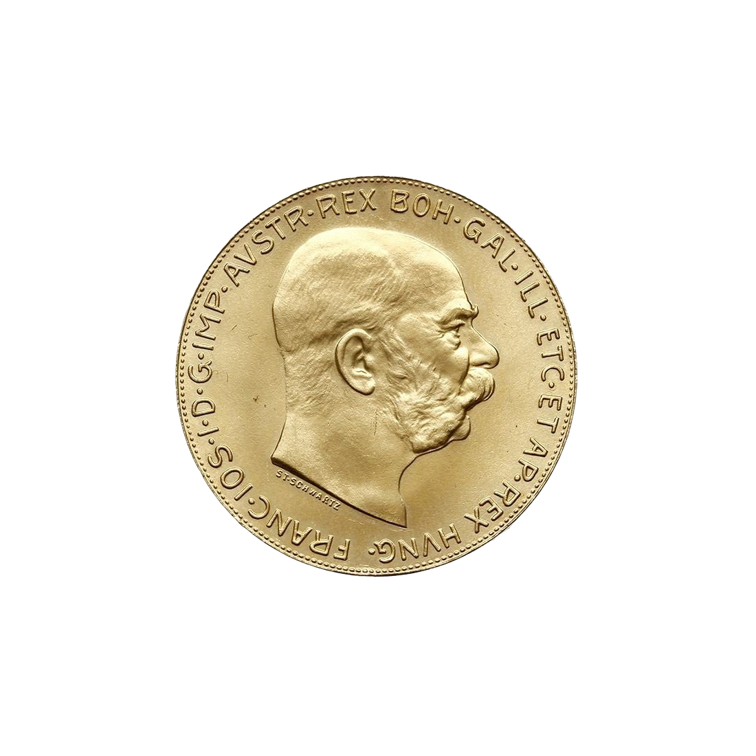 The gold coin worth 100 Austrian crowns was minted from 900 fineness material. Historically, gold coins have been minted since 1892, when Franz Joseph I began currency reform in Austria-Hungary. The gold coin with a face value of 100 crowns was issued from 1908 in honor of the emperor's diamond jubilee.