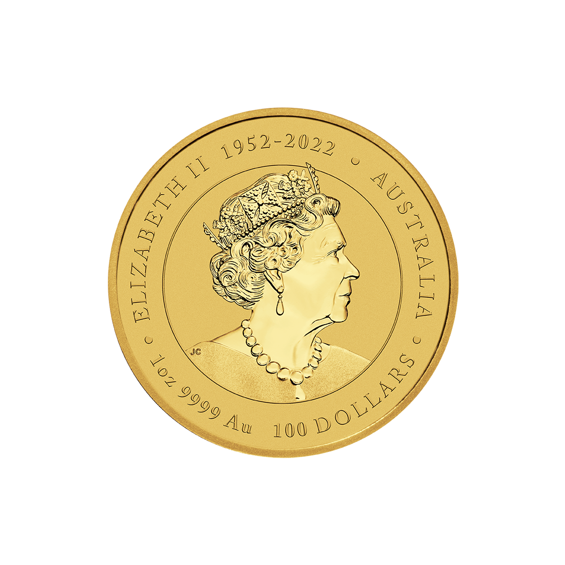 The obverse was designed by Ian Rank-Broadley and features a portrait of Her Majesty Queen Elizabeth II, along with the dates of her reign (1952–2022), as well as the weight, fineness, and denomination.