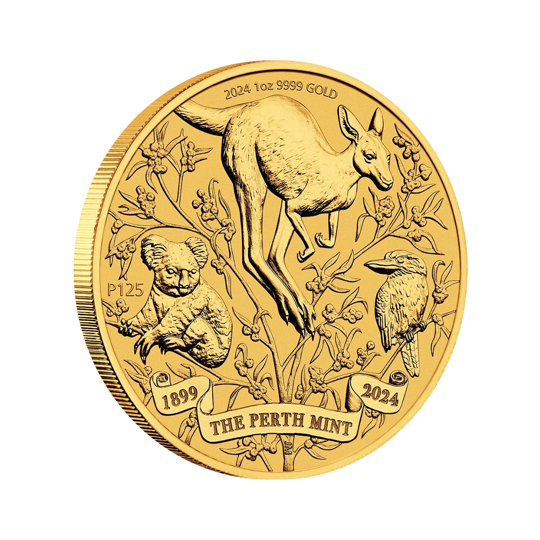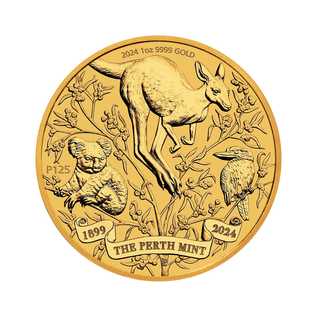 Referencing its most famous contemporary coin series, this coin features a kangaroo, kookaburra, and koala artistically placed among golden wattle, Australia's national flower. At the bottom of the design is the inscription: 1899 THE PERTH MINT 2024. Additionally, the mint mark P125 and the weight, purity, and year of minting are also included.