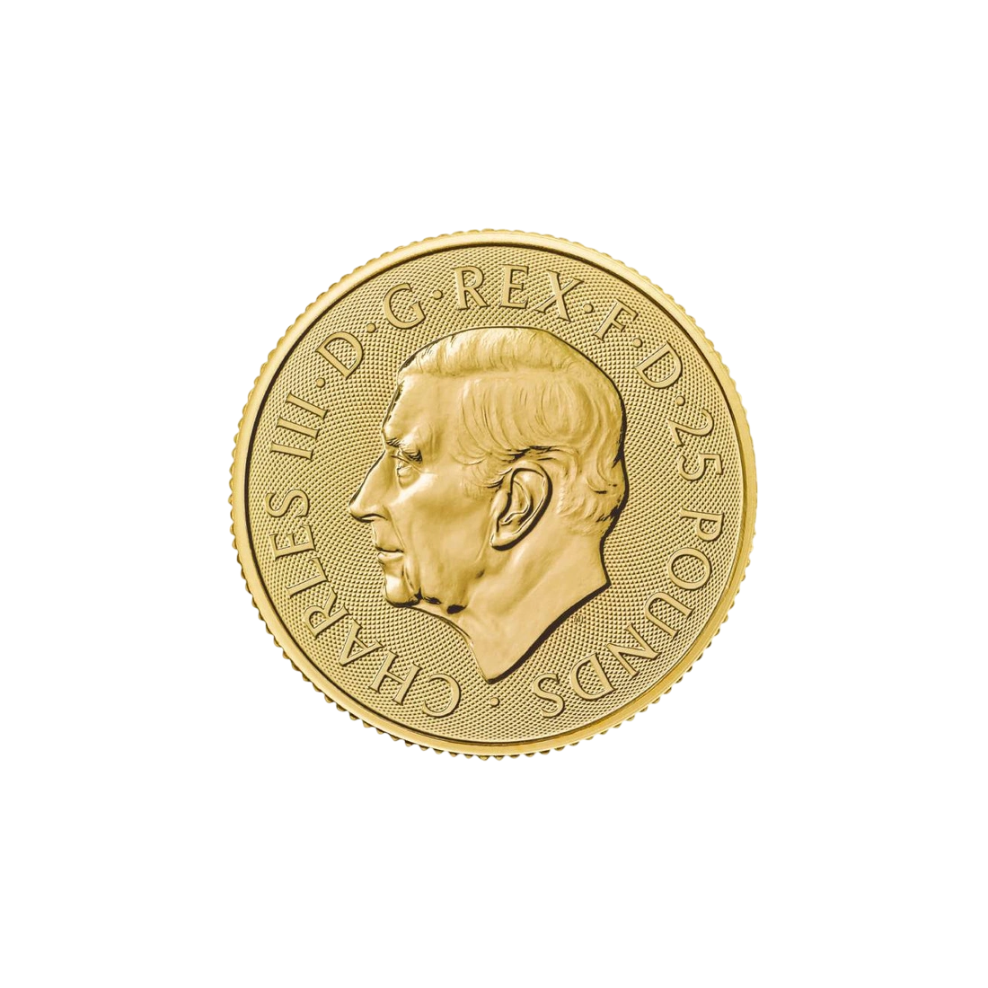 The coin was minted from 1/4 troy ounce of pure gold with a fineness of 999, which guarantees its high investment value. The coin has a diameter of 22 mm and a face value of 25 British pounds. The reverse features an image of a heraldic unicorn holding a coat of arms, surrounded by the inscription "SEYMOUR UNICORN," the date of issue, and information about the weight and fineness of the metal. The obverse is decorated with a profile of King Charles III, designed by Martin Jennings.