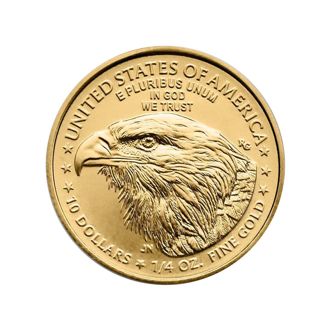 The American Eagle 1/4 oz is a gold coin with a face value of US$10, made of 24-karat gold with an admixture of silver and copper. It is produced at the United States Mint from bullion sourced locally.