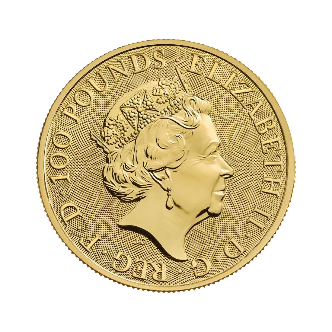 The obverse features an image of Her Majesty Queen Elizabeth II. The queen's name is engraved around the edge, along with the abbreviation of the Latin phrase "Dei Gratia Regina, Fidei Defensor," meaning "Queen by the Grace of God, Defender of the Faith," and the denomination of 100 pounds on a guilloche background.