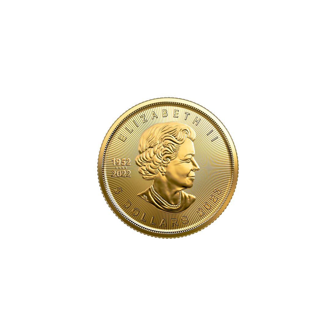 This 1/10-ounce gold coin from 2023 commemorates the reign of Queen Elizabeth II, whose portrait has graced the obverse of the Canadian Maple Leaf since its first issue.