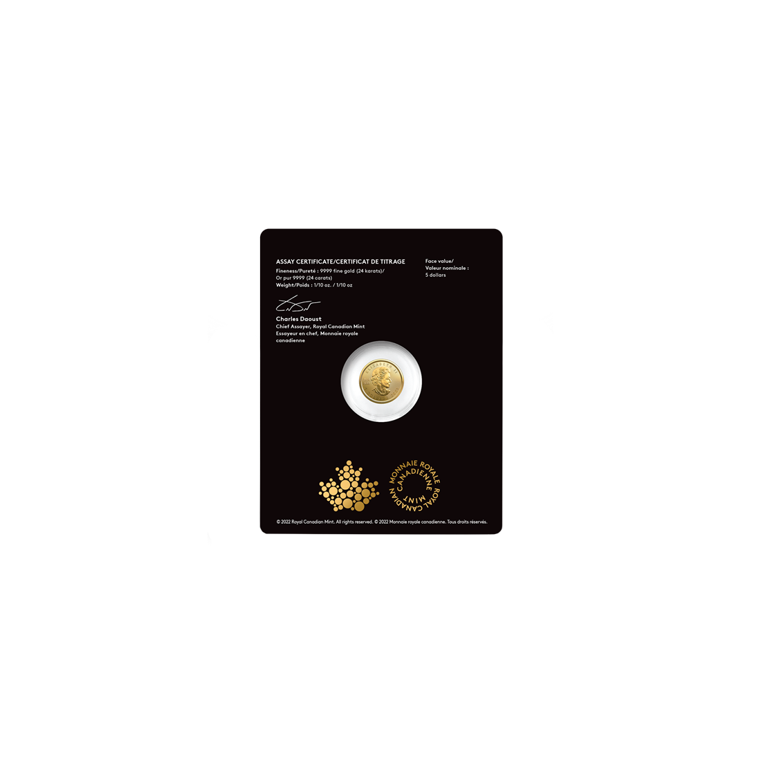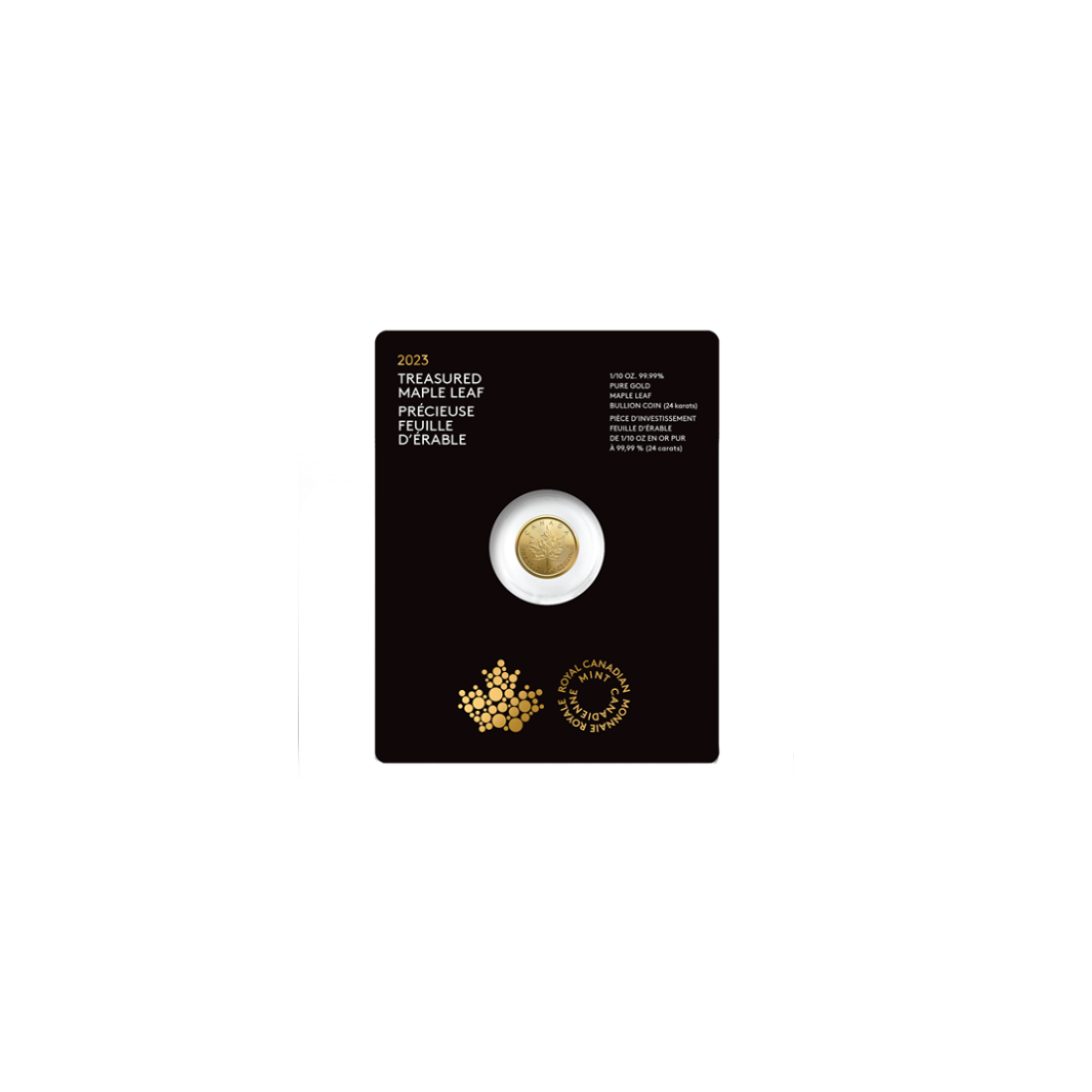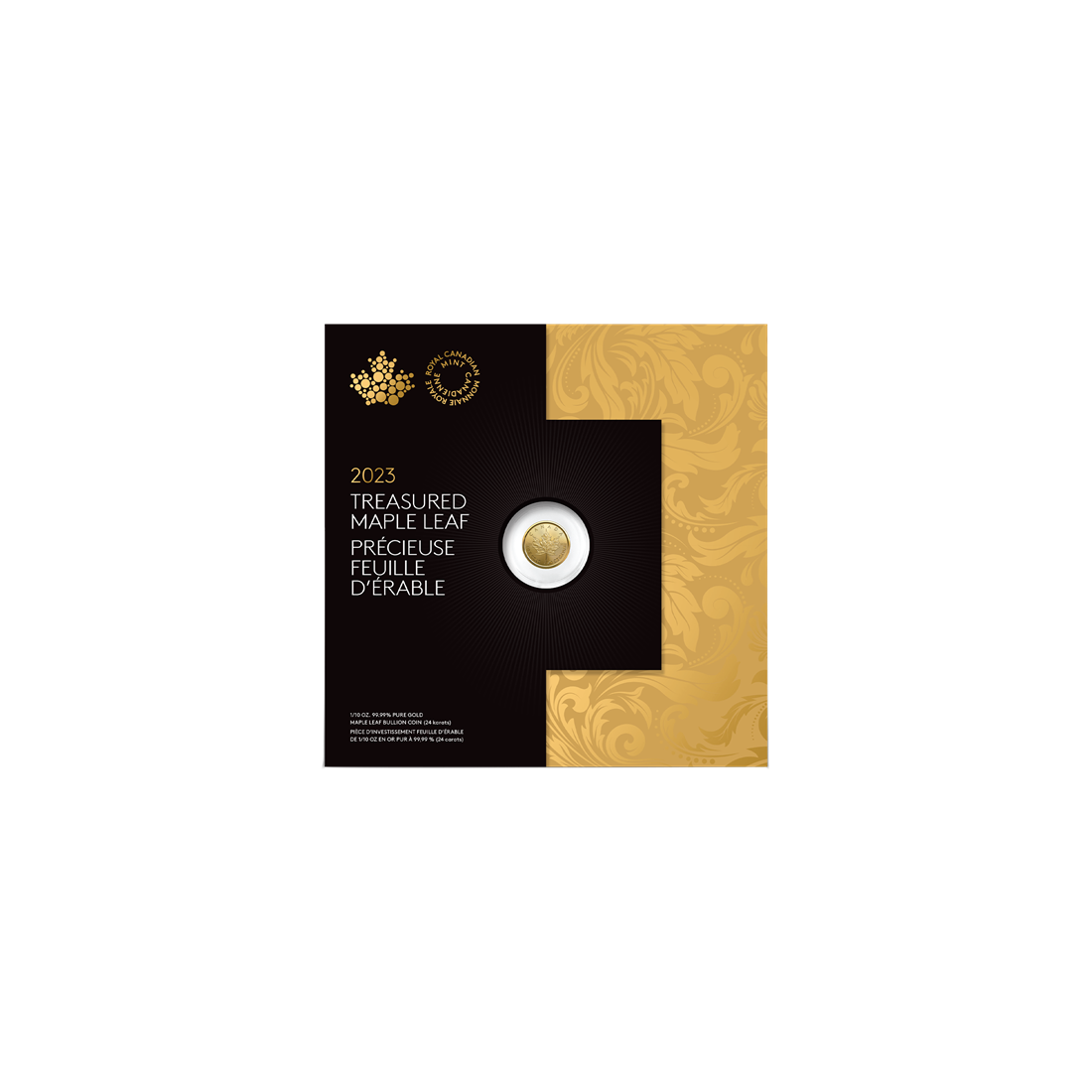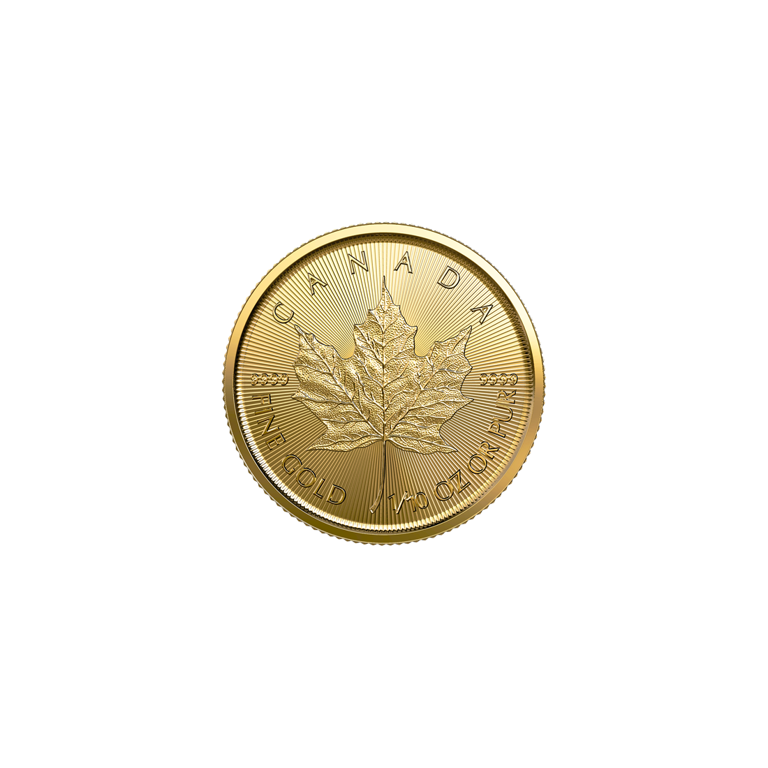 The reverse of the coin features, of course, a maple leaf rendered with extraordinary precision against a background of radiating lines. Above it is the inscription “CANADA,” and below it, “FINE GOLD 1/10 OZ OR PUR.” The design also includes the gold fineness mark “9999.”