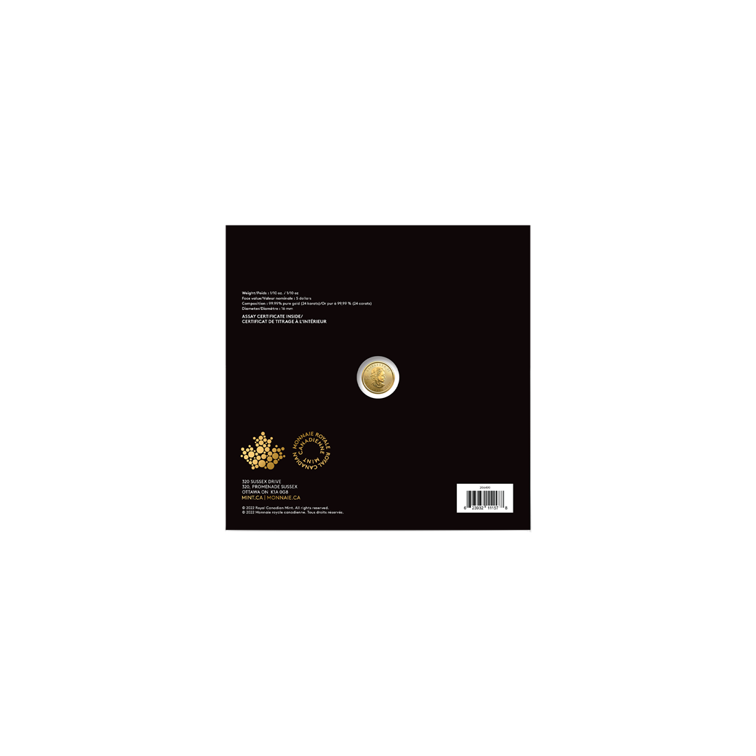 This exceptional, collectible 5-dollar Canadian coin impresses not only with its beautiful craftsmanship and attention to every detail, but also with the quality of the precious metal—it is made of 24-karat gold with a purity of 99.99%.