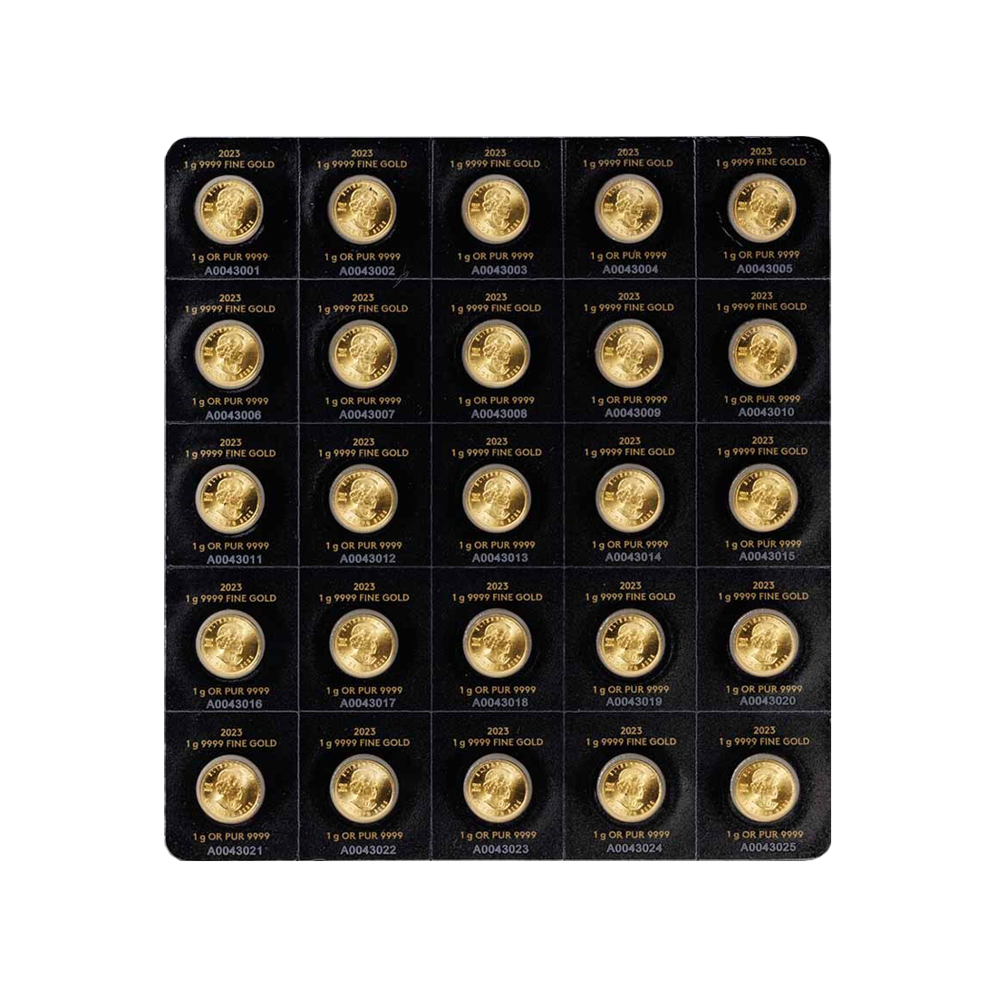 The Mint is pleased to present the Canadian Maple Leaf MapleGram – 25 one-gram Canadian Maple Leaf gold coins, enclosed in an elegant protective card that also serves as a certificate with a unique serial number for each coin.