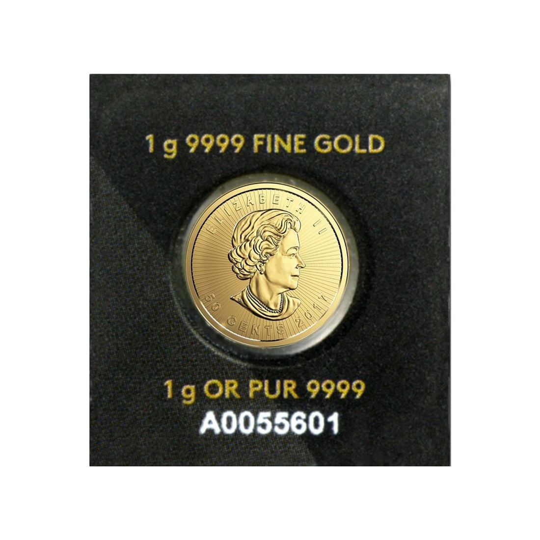 The reverse of each coin features a maple leaf and the fineness mark, along with the inscriptions "Fine Gold 1g or pur" and "Canada." The obverse features a portrait of Elizabeth II surrounded by the denomination and date of issue. The gram gold coins are therefore identical to the larger versions of the famous Canadian Maple Leaf.