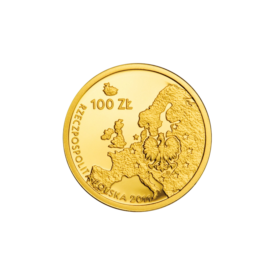 The obverse shows the outline of Europe with Poland highlighted, featuring an image of an eagle – the emblem of the Republic of Poland. Twelve stars, referring to the flag of the European Union, are arranged around the eagle. On the left side is the denomination "100 ZŁ," and at the bottom is the inscription: "RZECZPOSPOLITA POLSKA 2011." Under the eagle's left talon is the mint mark: "M/W."