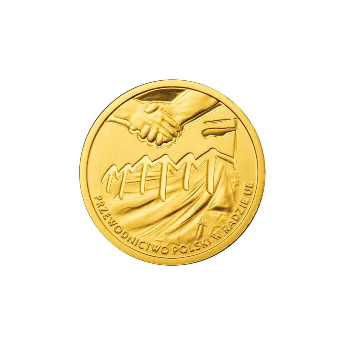 The reverse of the coin features a stylized image of the logo of Poland's Presidency of the Council of the EU against the background of a fragment of the European Union flag. Above the logo are clasped hands, symbolizing unity and cooperation. Below is the inscription: "POLAND'S PRESIDENCY OF THE COUNCIL OF THE EU."