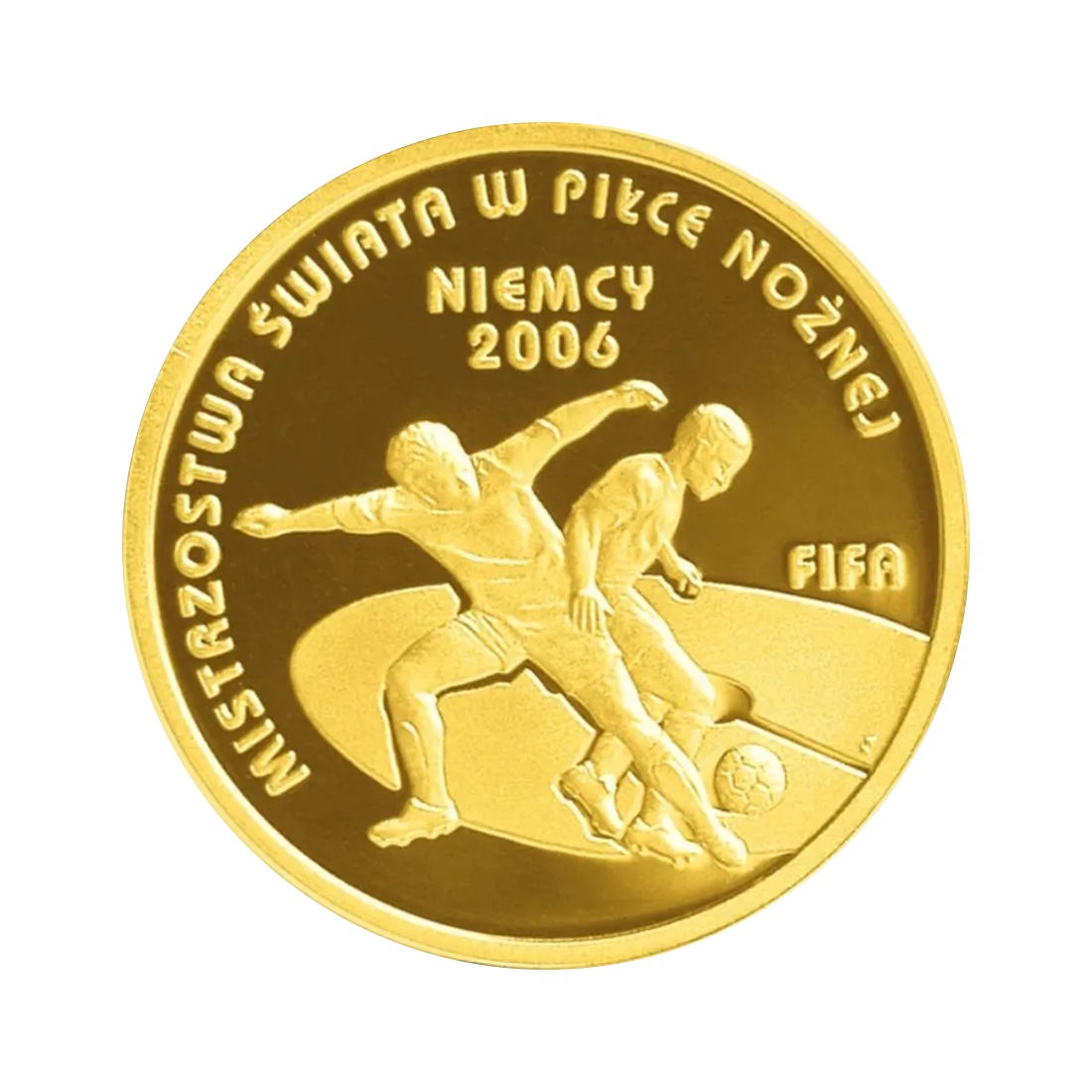 This gold coin commemorates the 2006 FIFA World Cup in Germany, serving as a valuable collector’s item and souvenir for soccer fans. It was issued in a limited edition of 10,500 pieces by the National Bank of Poland.
